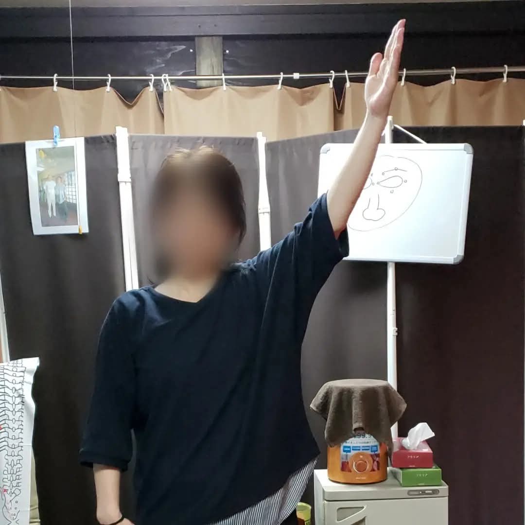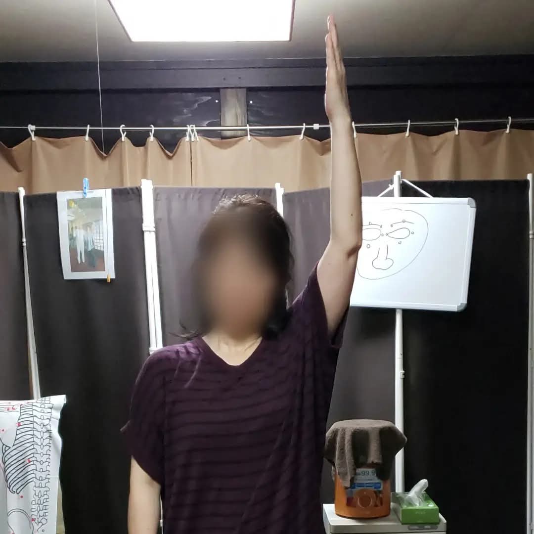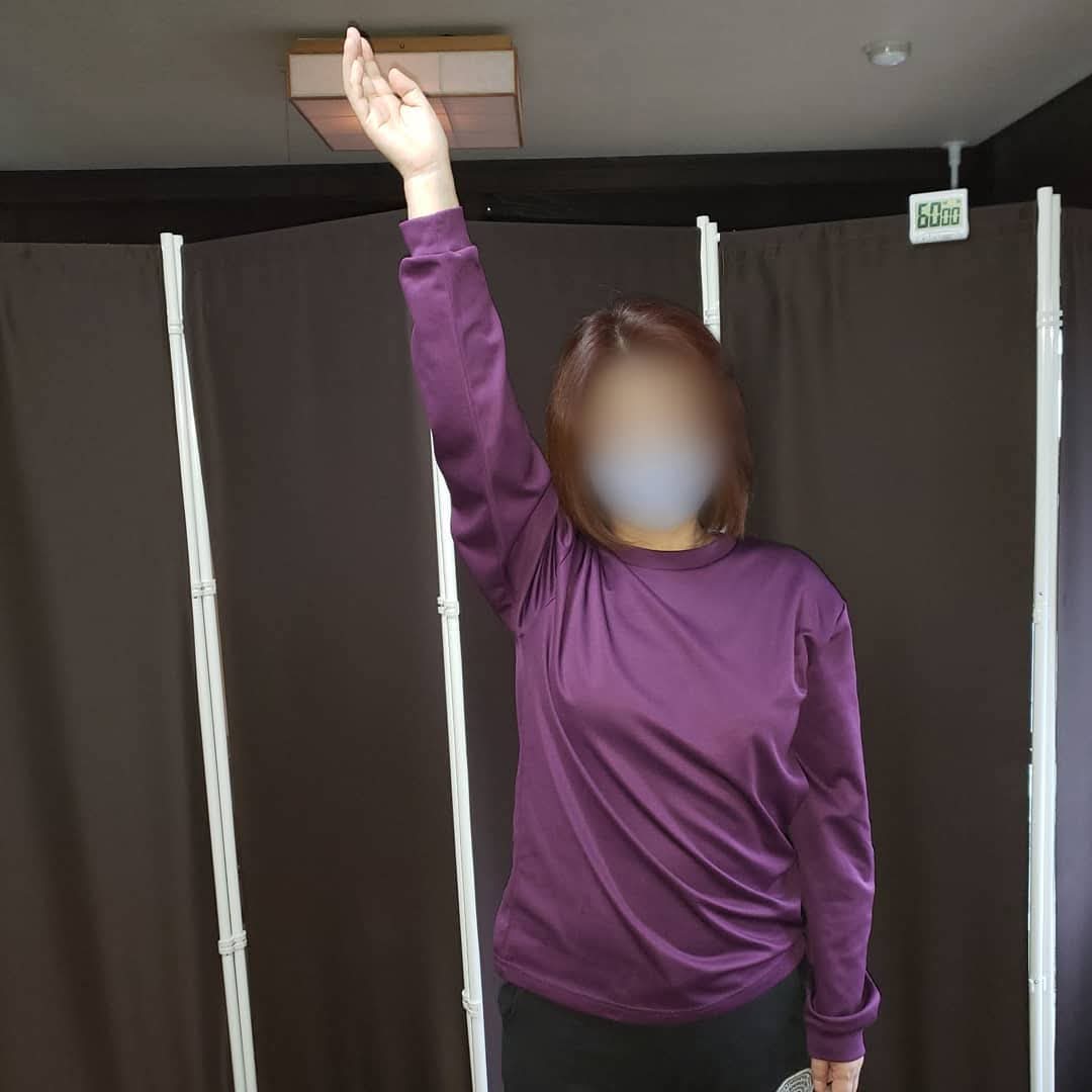 肩が痛くて上がらなかった女性、1回の施術でほぼ上まで上がるようになりました。